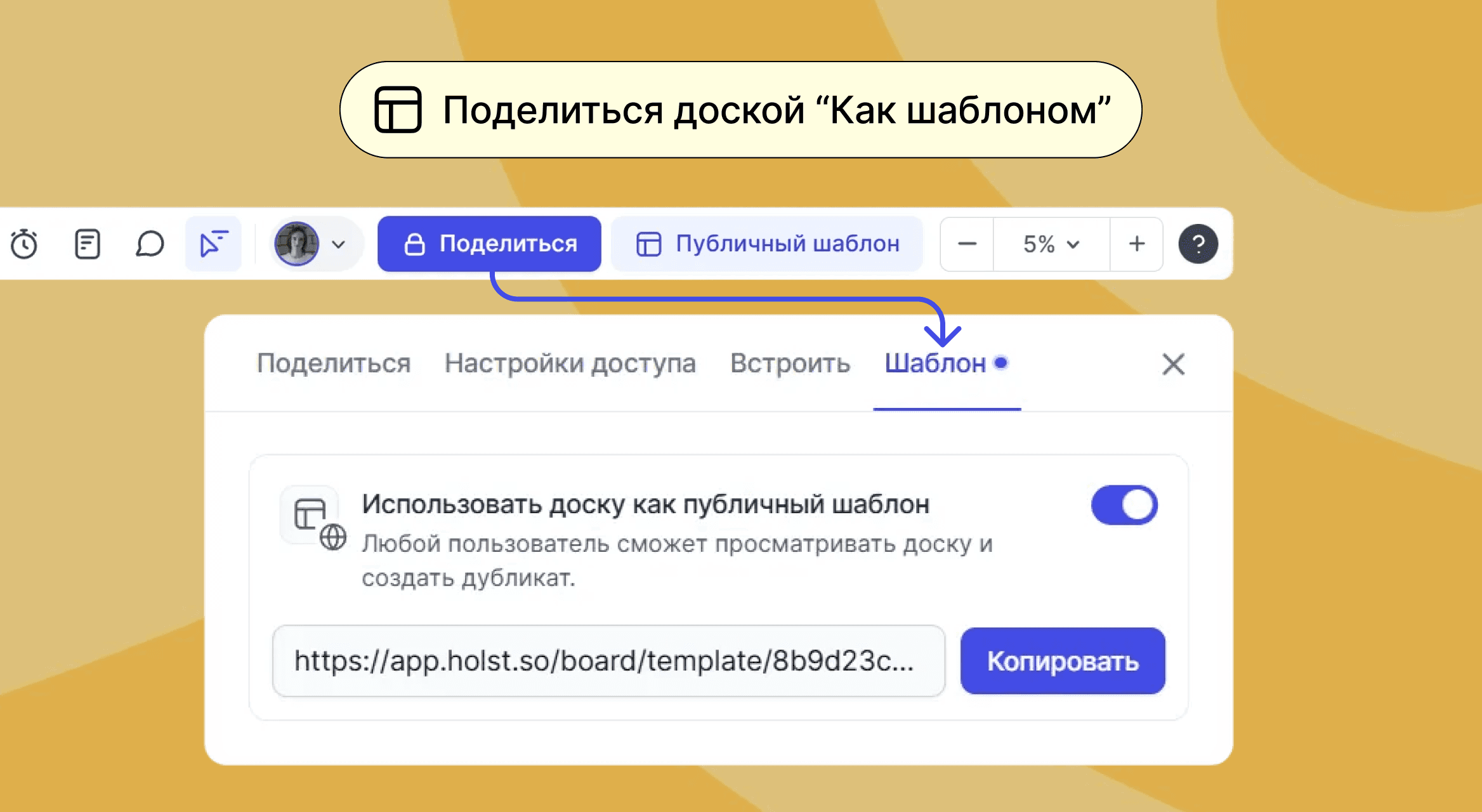 Пока мы готовим полноценный центр шаблонов со стандартными и пользовательскими наборами, выпускаем первый шаг — возможность поделиться доской по ссылке в формате «Шаблон».