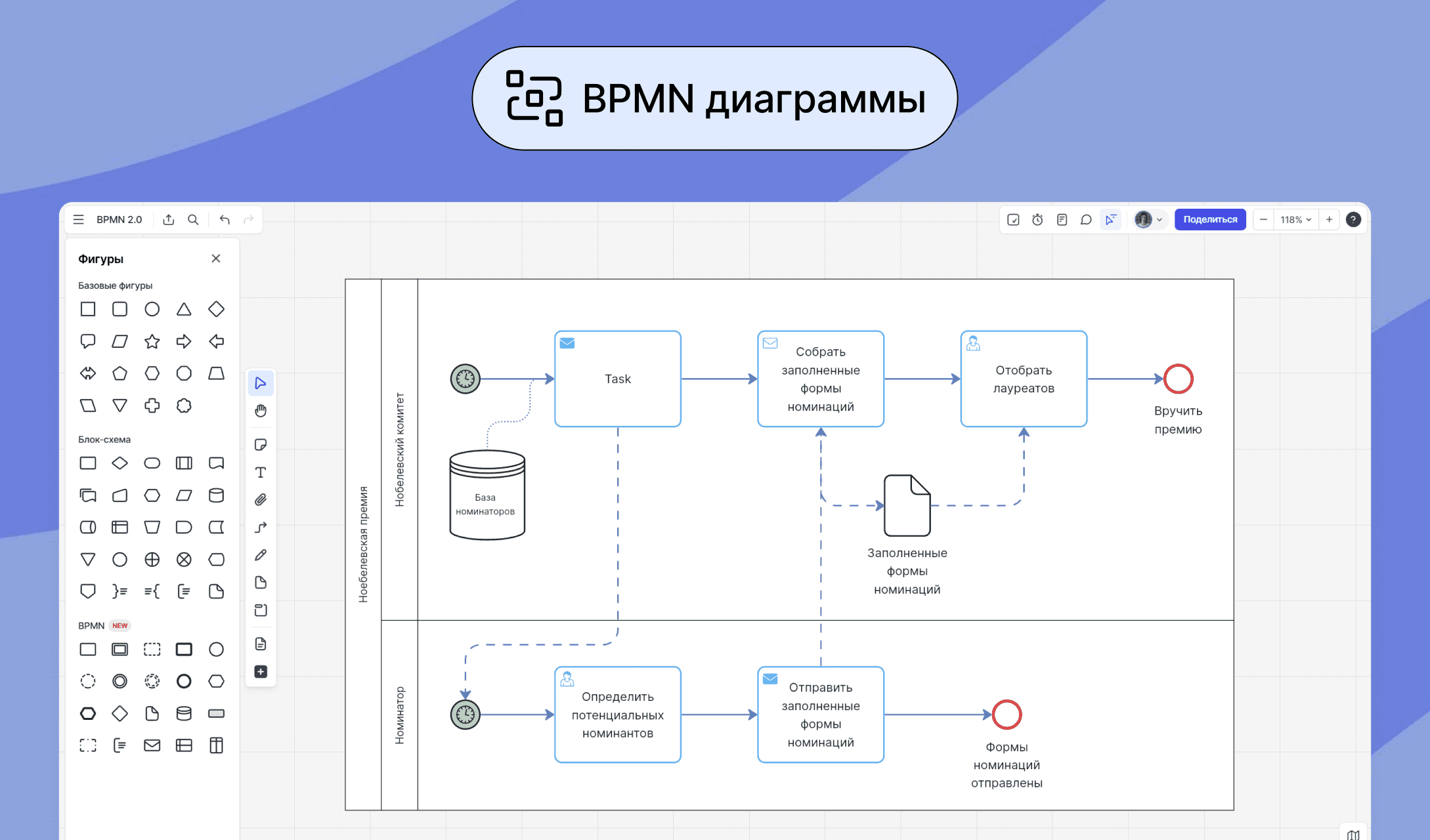 У нас появился набор для отрисовки диаграмм в BPMN-нотации. Все стандартные фигуры и переключение маркеров уже доступны для работы.